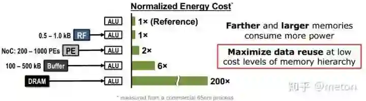 上图展示了DNN加速器在体系结构设计所关注的几个点:数据的读写也就是访存,以及计算。尤其是访存问题,因为通常PE数目很容易堆上去,并行度上去后,数据读写往往会成为瓶颈,也就是常说的撞到“内存墙”,内存访问在我们的机器上是有层级的,寄存器,cache很快,但是到了内存取数就很慢,数据在cache miss后代价会很大,因此如果没有很好的访存优化,那么对于大数据的深度学习,加速比是很难做上去的。