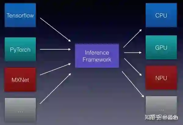 举个例子,你使用Tensorflow或者Pytorch为服务器端的Nvidia GPU所实现的算子操作(一些列cuda 函数) 完成了模型在GPU的训练,你得到了模型参数,接下来你被要求将模型部署到手机端cpu,那么可以肯定的是,你训练时候所使用的那些cuda函数肯定在手机端用不了了,怎么办呢?你需要针对你手机端的指令集架构Arm,重新手写算子(实现一些前向推理需要的卷积啊池化操作的函数,并且实现方式还必须高效,不然到时模型跑起来速度太慢也没有意义) ,这样你的模型才跑得起来,只手写一套你觉得还OK,顶得住,那如果还要部署要其他类型的设备呢?问题变得繁琐起来...