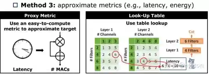 估算搜索出来的网络架构的参数,由此推算该网络的乘加操作次数,如果超出了设定的约束范围,那么可以间接预估出该网络架构过于复杂,不符合要求,那么直接丢弃这个设计,连训都不用训。另外可以建立查找表记录各个搜索出来的网络架构的时间,根据表中信息,可以推算出新网络架构的时间。