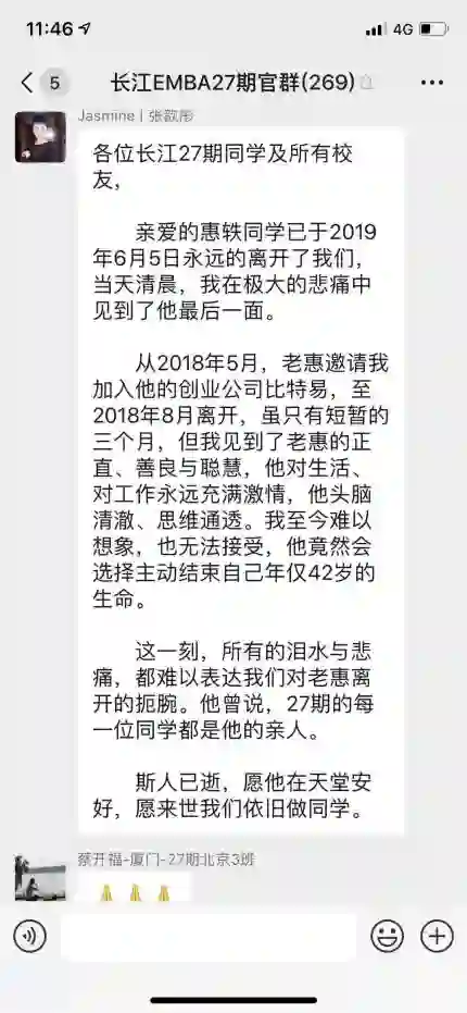 信源来自比特易前联合创始人张歆彤,她在长江商学院同学群中宣布, “亲爱的惠轶已于6月5日永远的离开了我们。当天清晨,我在极大的悲痛中见到了他最后一面。从2018年5月,老惠邀请我加入他的创业公司比特易,至2018年8月离开,虽只有短暂的三个月,但我见到了老惠的正直、善良与聪慧,他对生活、对工作永远充满激情,他头脑清澈、思维通透。我至今难以想象,也无法接受,他竟然会选择主动结束自己年仅42岁的生命。”