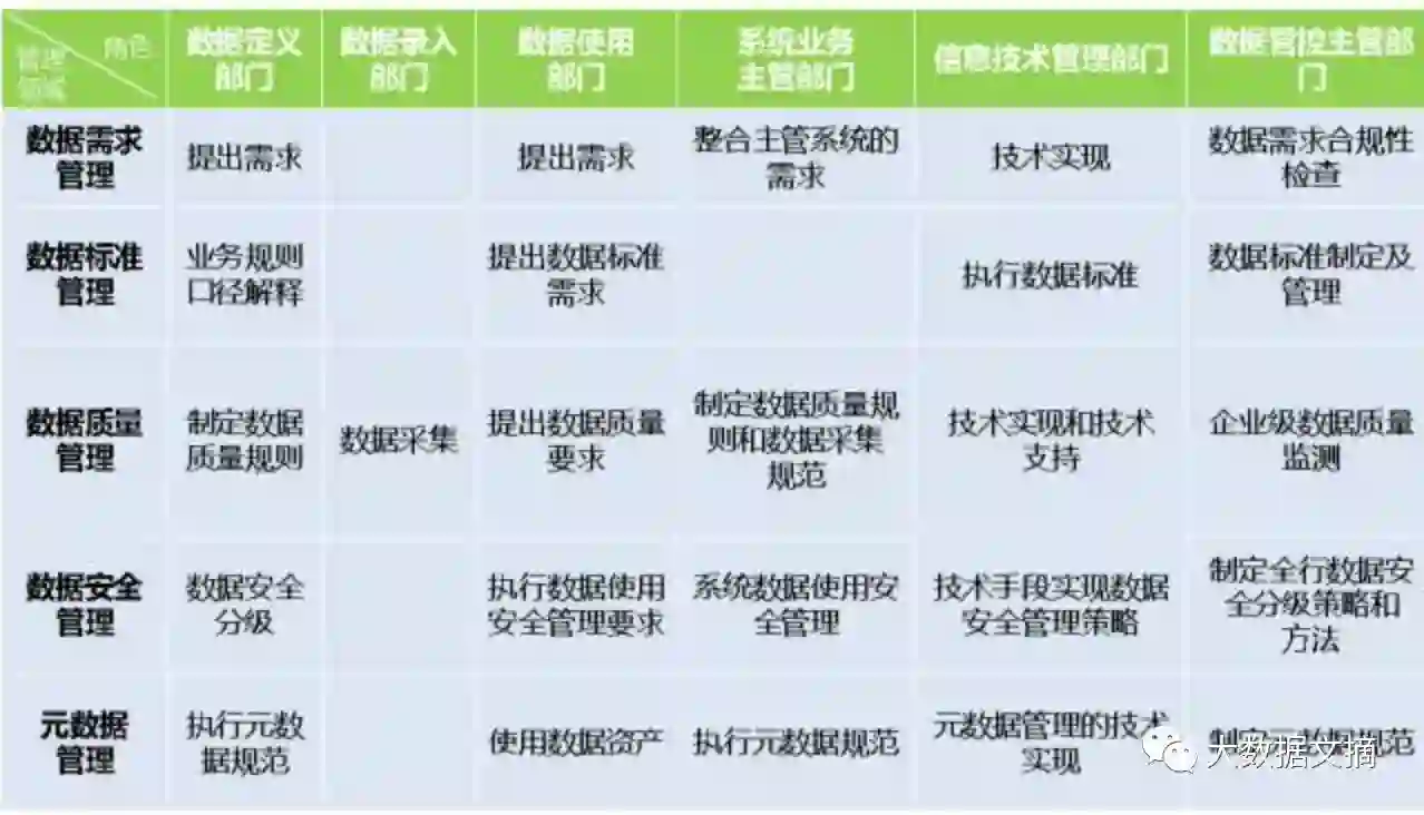 在这样的背景下,就需要建立全员参与的数据管理文化。这个文化是通过在强大的技术支撑下,构建由六个角色和五个管理领域组成的数据管理职责任责矩阵来完成的。从最基础的数据需求、数据标准的制订,到数据质量、数据安全和元数据的管理,都由各个部门一起参与,不但业务、数据和技术部门彼此分工合作、各司其职,执行部门和管理部门也要构成一个从制订、使用到监督、改进的完整闭环。