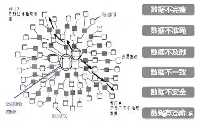 建行近三十年的信息化历程中,前二十年建成的竖井式、分散化业务处理系统。一方面实现了业务的信息化、提高了业务处理效率,但也不可避免地造成了不完整、不准确、不及时、不一致、不安全、冗余等数据问题。这些问题在信息化后期成为建行管理水平提升的瓶颈。