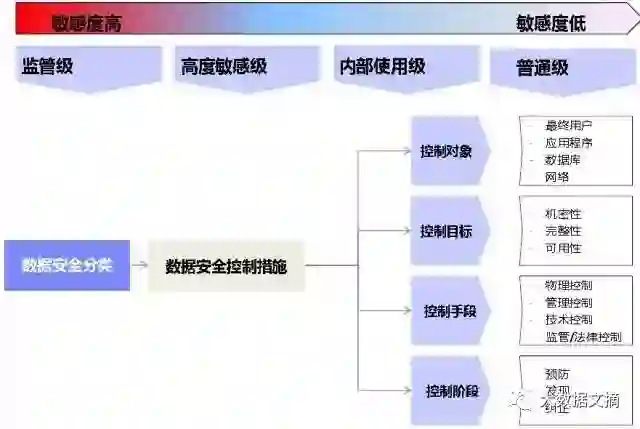 建设银行采取的措施是给数据分级,根据安全的级别不同,进行不同级别的管控。对于对象、目标、手段、阶段都要进行细分,针对不同的级别采取不同的控制措施,再用技术加以实现,由此来保障数据的安全。根据数据的敏感度,建行将数据分成了四个层级——监管级、高度敏感级、内部使用级、普遍级。这样,就可以在保证数据使用便利性的条件下,实现数据分等级的控制。