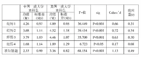 表1 中美一流大学本科生在求知旨趣和课程学习经历质量上的差异