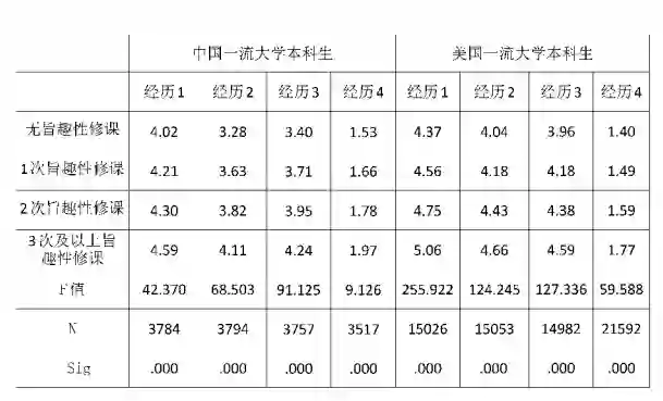 表2的统计结果清晰地表明,在4种课程学习经历质量上(即经历1到经历4),旨趣性修课次数越多的学生(即求知旨趣越强的学生),他们的课程学习经历质量也越高。这个结论对于中美两国的一流大学本科生都存在着共通性。