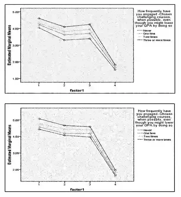 很明显,从这道问题的内涵成分来看,突出了“求知旨趣”的三个最重要的特征,即:(1)纯粹性,一种对知识的纯粹兴趣在驱动着学习者的学习和求知;(2)挑战性,这种纯粹的兴趣驱使着学习者敢于接受挑战,即使修读该课程可能导致外在的利益损失(如GPA降低),学习者也会敢于挑战自我和发展自我;(3)持续性,无论有多大困难或面临多大的挑战,对知识的纯粹旨趣驱动着学习者坚守其中、不言放弃。在该题项上,得分越高,说明学习者的“求知旨趣”越强烈。笔者与SERU调查的负责人(美国加州大学伯克利分校的调研团队)进行了交流,他们也强调,这道题项的设计的确旨在考查学生在“有挑战度的知识”上的“纯粹的知识兴趣”。