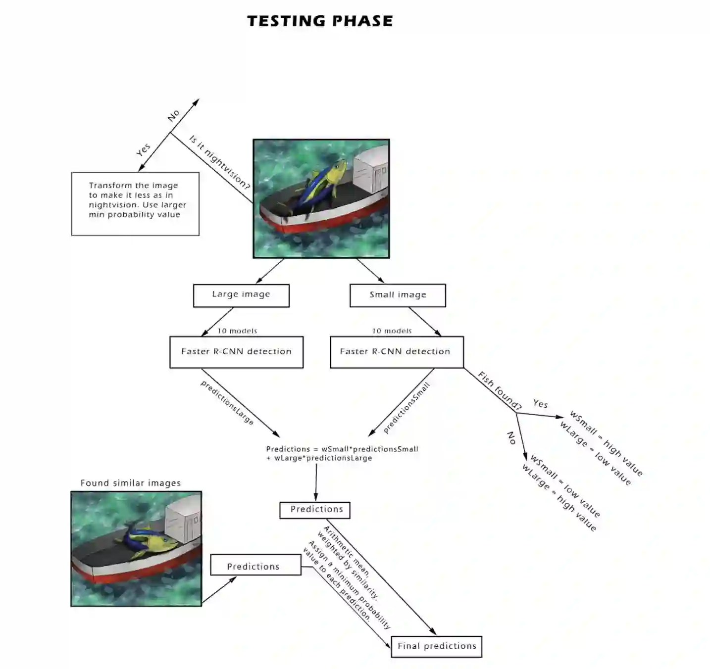 因为这个模型性能非常好,我们还添加了一个不单独使用夜视图像的模型,但却加长了所有图像的对比度。因为这是分别在每个通道上完成的,可能会改变鱼类或周围环境的颜色。由于数据中海洋里光照条件变化多端,真实图像中的颜色不太稳定,所以这种方法结果看上去还是很好的。