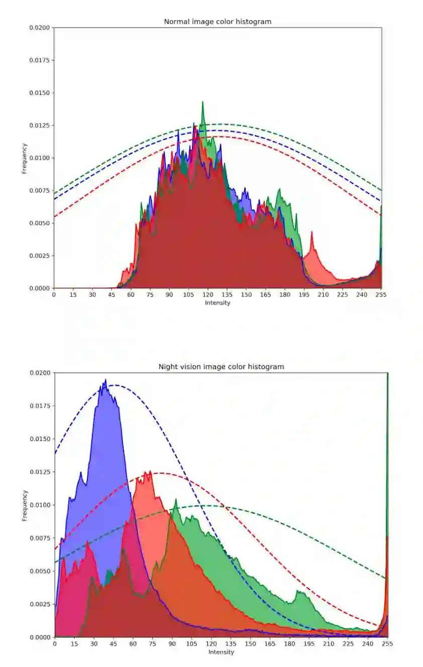 我们在早期注意到,夜视图像真的很容易识别——只需检查绿色通道的平均值是否比红色和蓝色通道两者相加的均值更亮就行了,加权系数为 0.75,在所有情况下都适用。观察典型正常图像和夜视图像的颜色强度直方图,可以清楚地发现差异,因为常规图像的颜色分布通常彼此相近,这可以从下图中看出。虚线表示近似这些分布的最佳拟合高斯。