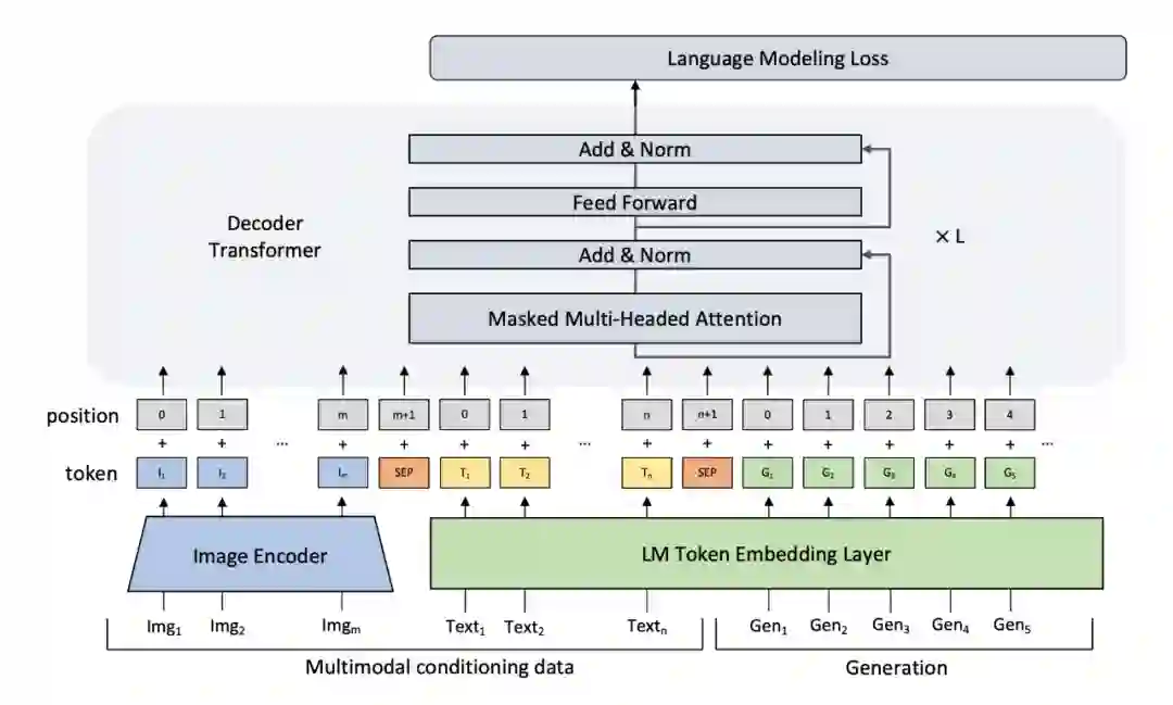 image 和 text(即商品 title),分别用 ResNet-152 和 embedding 映射到语言模型的同一个空间中为为 prompt,同时作为条件的文本输入和生成序列一同进行编码,最后再经过 Transformer Decoder 得到输出的描述。