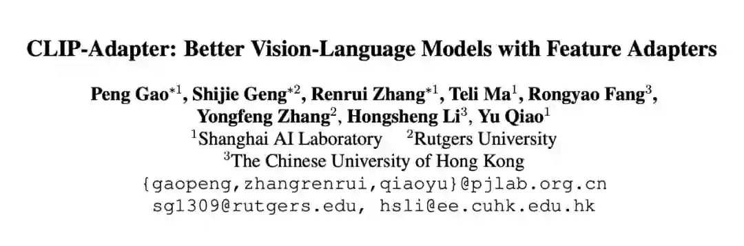 soft prompt 优化的 CoOp,由于 CLIP 的过度参数化和缺乏足够的训练样本,简单的网络调整会导致对特定数据集的过拟合。从而本文只需对轻量级附加特征适配器进行微调,受参数有效迁移学习中适配器模块的启发,作者提出了 CLIP-Adapter,它只调整少量额外权重,而不是优化 CLIP 的所有参数。