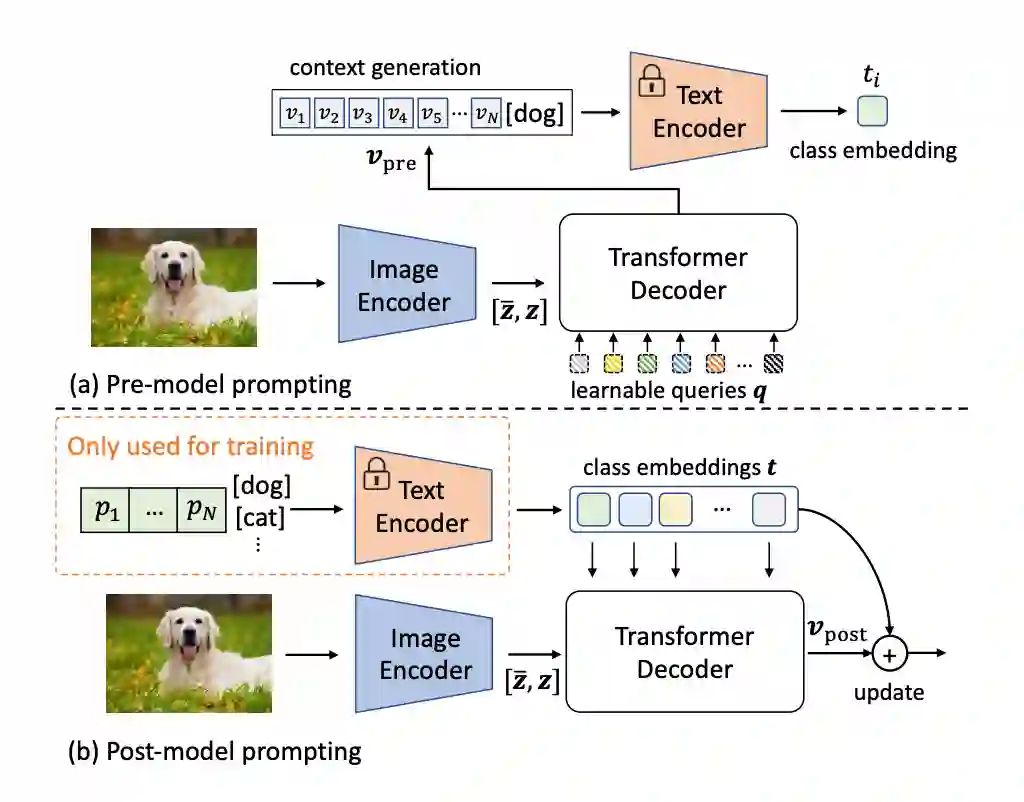 prompt post-model prompting:在文本编码器之后将视觉特征和类别向量传递给 Transformer 解码器生成类别向量表示。