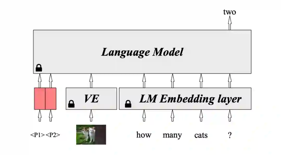 对 Frozen 的改进,Frozen 中的 image encoder 同时完成了两个目标:提取视觉特征、对齐图文空间的表示。本文对这两个目标解耦,image encoder 只负责编码图像特征,而对齐图文空间表示的任务交给 prompt 向量来做。这样视觉编码器的参数也变成固定的了,只有 prompt 向量的参数是可训练的。