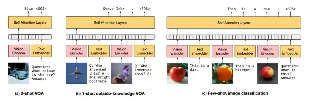 Vision Encoder 编码得到图片特征,再映射为 n 个 prompt 向量加到文本表示之前。Language Model 使用了一个 7 billion 参数规模的预训练好的模型;Vision Encoder 使用了 NF-ResNet-50。