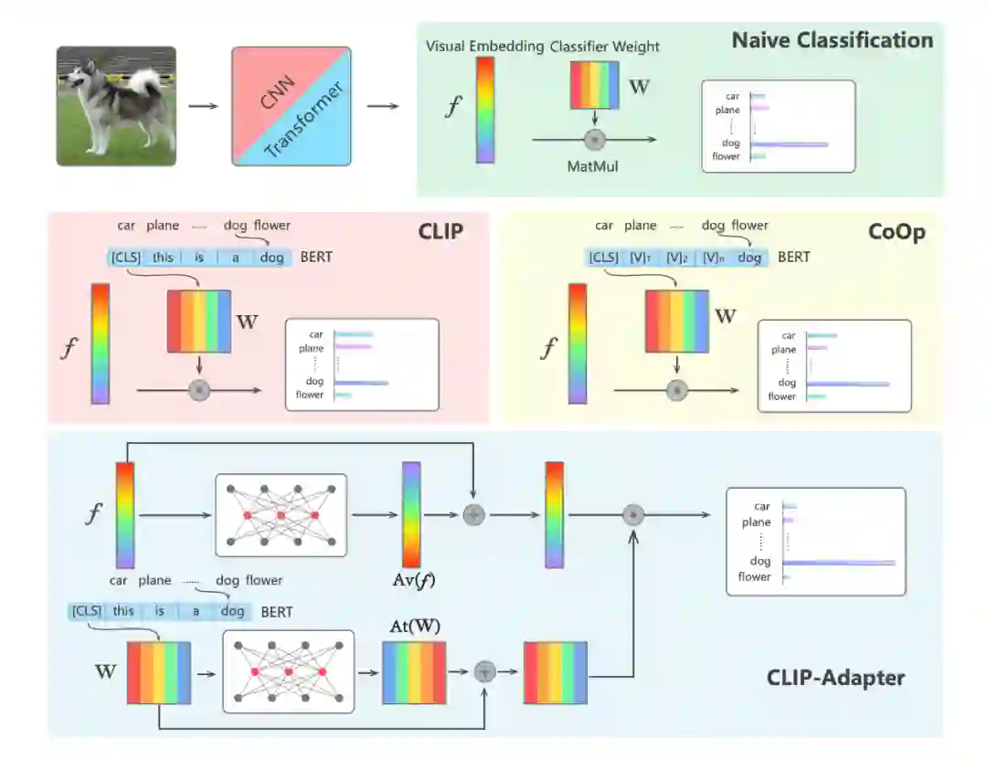 2. CLIP Adapter 通过残差连接将原始 Zero-Shot 视觉或语言嵌入与相应的网络调整特征混合。通过这种“残差样式混合”,CLIP Adapter 可以同时利用原始 CLIP 中存储的知识和来自 Few-Shot 训练样本的新学习的知识。