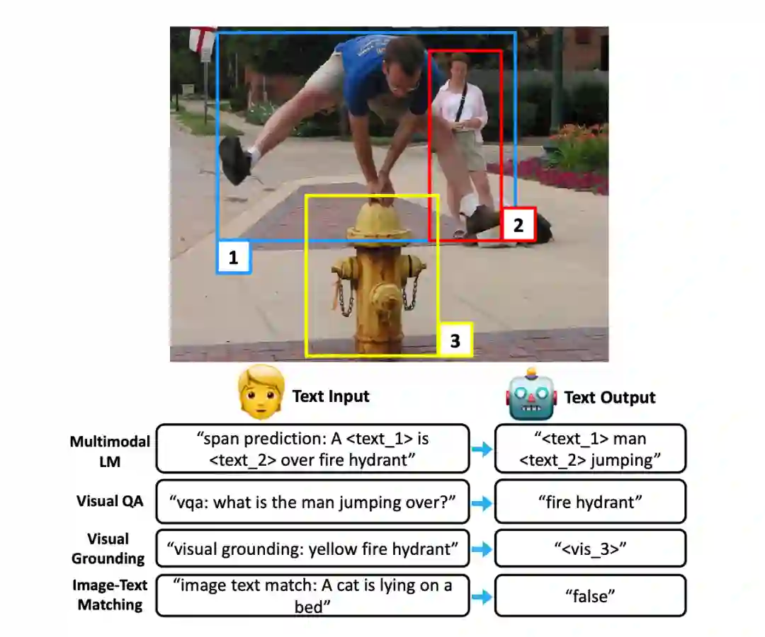 7 个多模态任务的 benchmark,包括 VQA, GQA, COCO Caption, NLVR2, VCR, MMT, REF-COCOg。所有任务的输入加上文本前缀(e.g.”vqa:”, “image text match:”)用于区分不同任务,输出都统一成 text label 的形式。对于 visual grounding 任务,图片特征输入时就加了类似 <vis_n> 的 region id,所以输出时可以用 text label “<vis_n>” 来指示预测的图片区域。