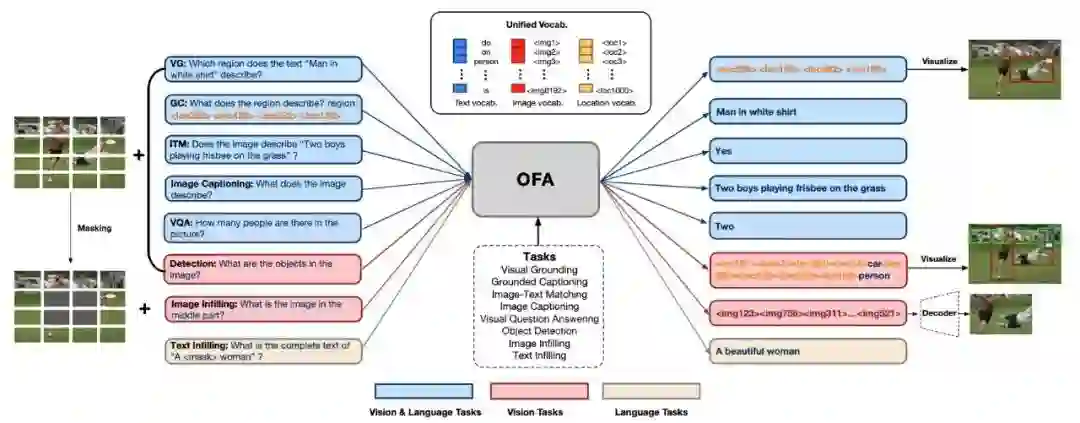 模态、任务、结构统一的模型 OFA,将多模态及单模态的理解和生成任务统一到 1 个简单的 Seq2Seq 生成式框架中,OFA 执行预训练并使用任务 instruction/prompt 进行微调,并且没有引入额外的任务特定层进行微调。