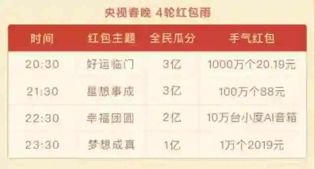 第三轮语音互动“幸福团圆”红包送出了10万台小度人工智能音箱及现金红包,共计2亿元。