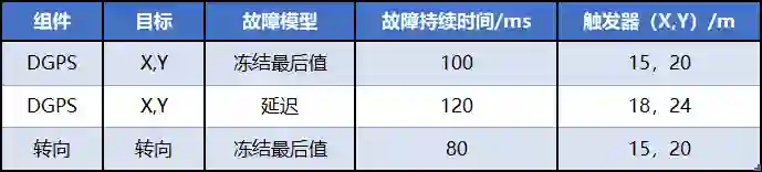 本次研究所做 FI 仿真试验为在交通流畅的城市环境下,以 45km/h 的恒定速度行驶并开启车道保持功能的车辆,当车辆在弯道上行驶时将触发故障,再现与差分 GPS(DGPS)和转向系统相关的功能失效模式。实验中所设置故障列表如表 1 所示。
