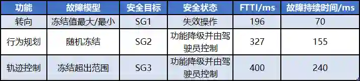 FTTI 和安全状态的确定。如图 2 所示,FTTI 是从一个故障被注入到危害发生之间的时间。对于高级自动驾驶系统,FTTI 决定了使车辆不会失去控制所需的容错等级(如冗余、功能降级)。