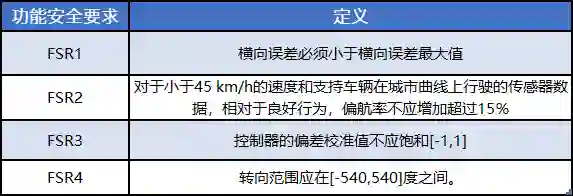 在上一流程所得安全目标的基础上,结合 FI 仿真结果推导得到功能安全要求,如表 5所示。其中最大横向误差的计算公式如下所示: