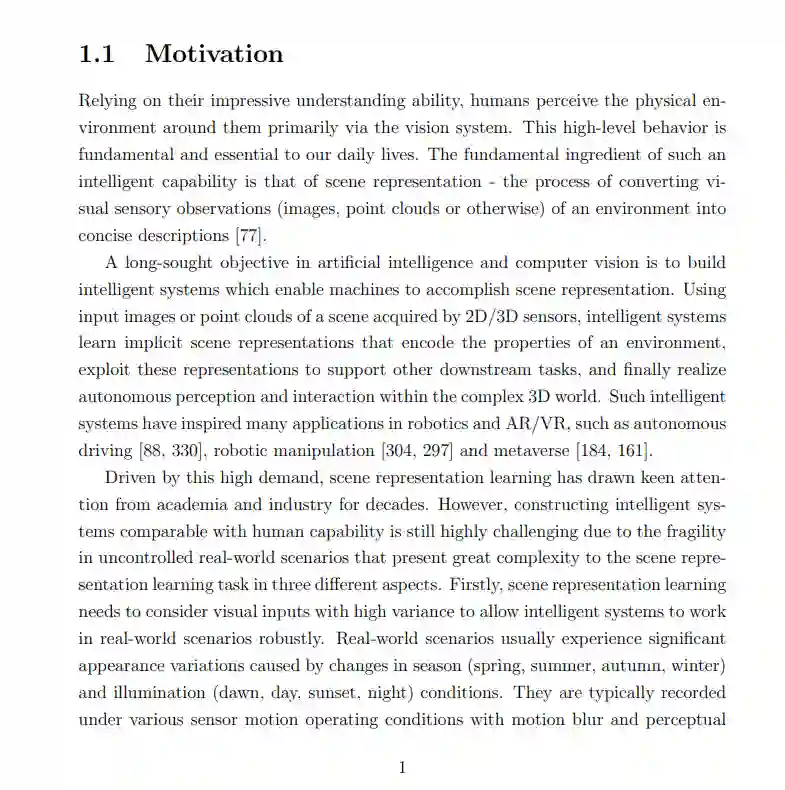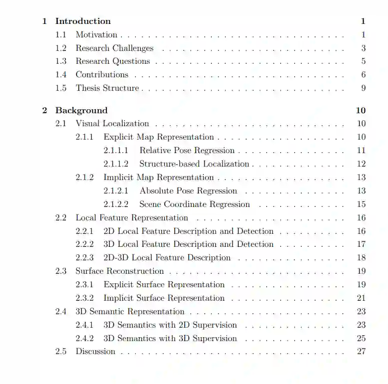 。然而,由于不受控制的现实场景的脆弱性,构建健壮的系统仍然具有很高的挑战性。由于对场景变化的传感观察的差异,不同类型的视觉表示之间的领域差距,以及对多类别信息的高效感知的要求,这为场景表示学习带来了巨大的复杂性。为克服这些挑战,本文追求鲁棒、统一和信息丰富的场景表示,从不同类型的视觉输入中学习几何和语义,为自主学习理解周围世界的智能机器铺平道路。在此背景下,本文在视觉定位、像素点匹配和语义曲面重建领域做出了三个核心贡献。