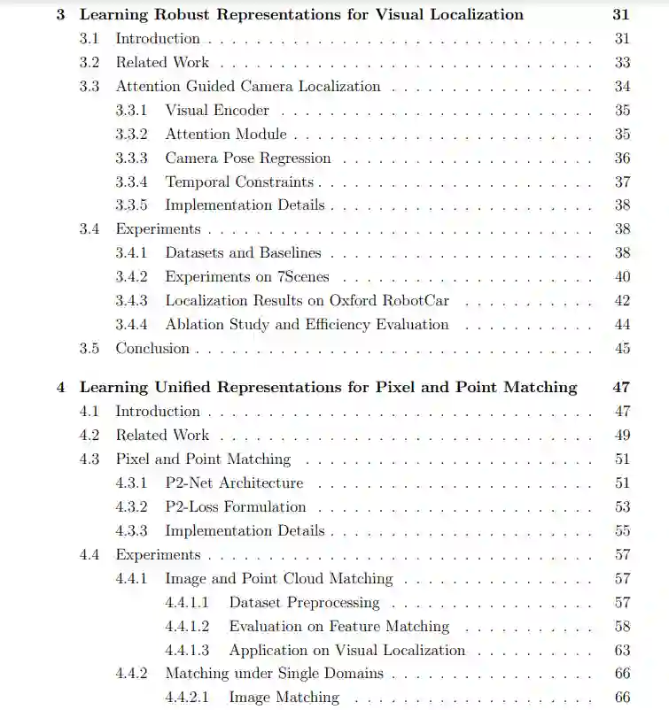 在这篇论文中,我们从单幅图像开始估计6自由度(DoF)相机姿态。为了学习对环境变化和传感器操作具有鲁棒性的场景表示,提出了一种结合自注意模块的神经网络来建模复杂的几何关系,给定的图像相对于参考环境进行拍摄。然后,基于极线几何和立体视觉的内在约束,我们构建了一个更通用的框架,在二维图像和三维点云之间寻找统一的表示形式。通过引入超宽接收机制和新的损失函数,提出了一种双全卷积框架,将2D和3D输入映射到共享的潜表示空间中,以同时描述和检测关键点,弥合2D和3D表示之间的差距。最后,我们将我们的研究扩展到开发信息表示,这通常是智能系统在现实场景中同时用于多个目的的操作所需要的。在借鉴以往基于点的网络研究成果的基础上,我们引入了一种全新的端到端神经隐式函数,它可以联合估计原始和大规模点云的精确三维曲面和语义。