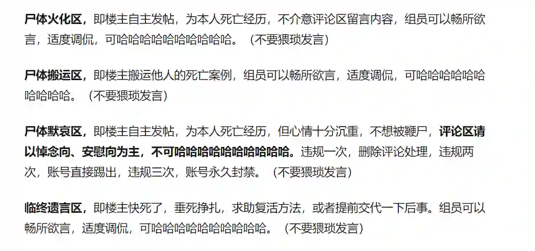 而如果心情过于沉重,无法承受组员的“鞭尸”,则可以在【尸体默哀区】里发帖,评论以安慰为主,组员被禁止调侃楼主,违反者将受到踢出处理。
