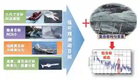 雷达作为目标探测和监视的主要手段,在空中和海面目标监视以及预警探测等公共和国防安全领域应用广泛。然而受复杂背景环境(陆地、城市、海洋等)及目标复杂运动特性的影响,目标雷达回波极其微弱、特性复杂,具有低可观测性,使得雷达对动目标的探测性能难以满足实际需求。复杂背景下低可观测动目标探测技术成为影响雷达性能的关键制约因素,也是世界性难题。具体体现在:1)目标运动特性复杂,雷达低可观测动目标主要包括“低(低掠射角照射,杂波强)、慢(慢速目标,易受杂波遮蔽)、小(小尺寸目标,回波微弱)、快(高速高机动目标,能量发散积累效果差)、隐(隐身目标,回波微弱)”等类型;2)强杂波极易湮没目标回波信号,并形成大量类似于目标的尖峰信号,严重影响雷达对弱小目标的探测和监视性能;3)雷达观测范围广,回波数据量大,新体制雷达采用数字化阵列等技术,在提高信号采样质量的同时进一步增加了数据量,对算法的实时处理提出了极高要求;4)存在岛屿、岛礁、陆海交界、强点源干扰、多目标等复杂情况。