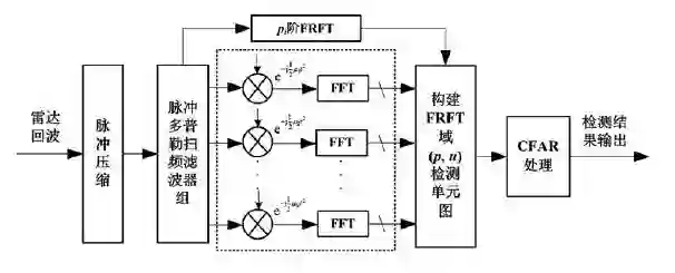 以傅里叶变换为核心的傅里叶分析理论体系在分析与处理平稳信号时具有极大的优越性,然而在雷达高速高机动目标探测、低慢小目标以及多目标的探测与识别中,信号呈现出时变、非平稳等复杂特性。分数阶傅里叶变换(fractional Fourier transform,FRFT)以LFM作为基函数,介于时域和频域之间的任意分数域表征,能够反映多普勒的变化规律,非常适于处理时变的非平稳信号,且无交叉项的干扰,从而引发了分数域信号处理理论的研究热潮。海军航空工程学院海上目标探测课题组研究了分数域海杂波抑制与动目标检测方法(原理框图如图4 所示),采用FRFT 谱及短时FRFT(short- time FRFT,STFRFT)。对目标信号匹配增强,实现时变非平稳信号的时频谱高分辨表示。