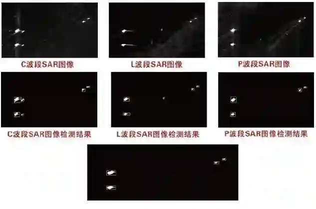 2)SAR图像中的舰船目标检测。SAR图像舰船目标检测主要分为直接检测舰船本身和通过检测舰船尾迹来确定舰船两种途径,前者适用于舰船相对海面背景较为明显的情况,后者则要求舰船处于运动状态。多波段SAR图像融合是舰船目标检测技术的一个研究热点,其融合层次包括像元级、特征级和决策级,图7给出了多波段SAR 图像3 种融合层次的流程图。图8利用同一区域目标的C、L和P波段SAR图像演示了多波段SAR图像决策级融合检测的处理结果。