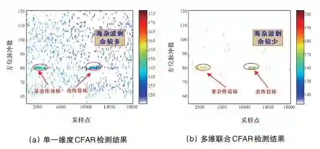 一方面是多维度信息的融合利用。融合利用多维度信息,可对回波信号进行更精细化描述,改善检测、估计、识别、评估和决策的性能。这些信息包括目标信息、背景信息及雷达信号资源部分。目标信息是指目标的RCS起伏特性、相关特性、运动学特性、变换域特征、非线性特征、微多普勒特征等;背景信息是指背景的电磁散射特性、统计分布特性、相关特性、变换域谱特性、非线性特性等;雷达信号资源是指雷达发射信号本身所具有的空域信息(阵元间、雷达间)、时域信息(脉间、帧间)、频域信息、波形信息(波形形式)、极化信息、频率信息、波段信息等。图11给出了多维度信息融合利用动目标检测结果,相比单一维度CFAR检测方法,多维联合CFAR检测结果杂波剩余明显减少,目标检测性能得到大幅提升。