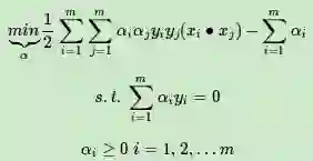 这个优化函数满足KKT条件,也就是说,我们可以通过拉格朗日对偶将我们的优化问题转化为等价的对偶问题来求解。我们可以先求优化函数对于和w和b的极小值。接着再求拉格朗日乘子α的极大值。