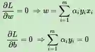 首先我们来求和w和b的极小值,即minL(w,b,α)。这个极值我们可以通过对和w和b分别求偏导数得到: