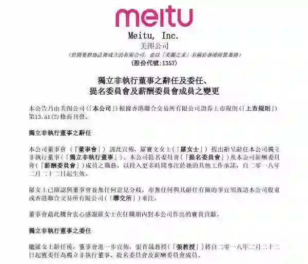 2 月 22 日,美图公司公告董事变更:罗宝文辞去公司独立非执行董事、提名委员会及薪酬委员会成员职务,以投入更多时间专注于她的其他工作承诺。同时,公司任命张首晟教授为独立非执行董事、提名委员会及薪酬委员会成员,任命即日起生效。