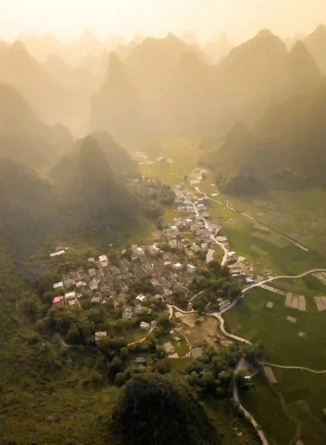 除了拍摄田间老农与山水,大可将无人机高飞(但不要超过120米的安全高度),此处信号干扰少,可让无人机安心爬升,升高之后,可见错落藏在峰林之间,点缀着画面,颇具世外桃源安逸感。