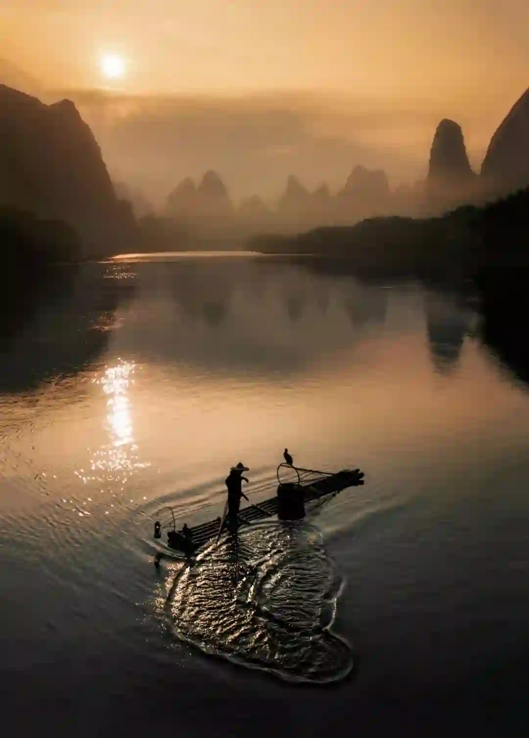 兴坪下龙码头,是摄影人开发出来“野景点”,只有一条水泥路直通。凌晨五点,伸手不见五指,河远处亮光若影若现。一老翁蓑衣竹排,跟随着两只鱼鹰,这就是桂林的另一个符号——漓江渔火。