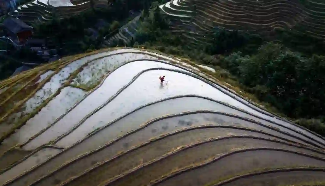 在5月中下旬,梯田待耕种,灌溉水进入梯田中。待天上出现了云彩或者阳光,取景框中再搭配劳作的农夫,农田中的倒影,神似云中的耕作,令人遐想。除了图片的拍摄,还可以尝试用无人机拍摄云雾流动的延时摄影。不少当地的摄影人,为了守候这仙境般的云雾,甚至甘愿在平安寨中,守候数天。