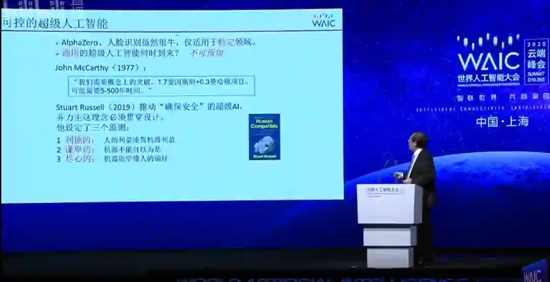 最新的“超级AI理论”提出是在2019年,当时伯克利大学的Stuart Russell在书中提到,虽然超级人工智能不知道什么时候到来,但是我们必须做好准备。他在书中设定了三个原则,每一个原则都要用严格的数学方法来实现,这三个原则分别是:1、利他的:人的利益凌驾机器利益;2、谦卑的:机器不能自以为是;3、尽心的:机器能学懂人的偏好。此外,他还提出了许多方法论,涉及概率理论和博弈论。