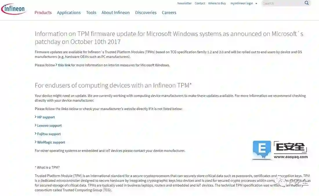 英飞凌公司于上周发布了相关固件更新,并将更新转发给各正在将英飞凌TPM固件更新整合至现有产品的主板供应商处。