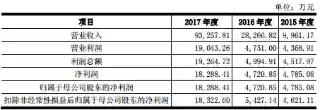 2015-2017年,趣炫网络主营业务收入分别为1亿元、2.8亿元和9.3亿元,同期净利润分别为4785.08万元,4720.85万元,18288.41万元。营业利润率分别为43.86%、16.81%和20.42%。同比主营业务收入增长率分别为183.78%和229.92%,净利润增长率为-2.08%和289.36%。