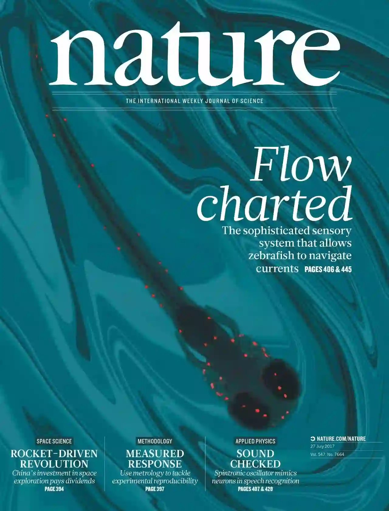 本期封面所示为斑马鱼(Danio rerio)幼鱼。在本期《自然》中,Florian Engert及同事考察了让鱼能够探测到所在水域水流的感觉系统。趋流性使鱼即使在缺乏任何视觉线索的情况下,也能始终溯流而上。作者调查了斑马鱼幼鱼的这种能力,发现其中的奥秘存在于一系列毛细胞(红色),又称为侧线。他们提出毛细胞通过探测鱼身体周边的局部流场旋转,判断水流流动方向。在野外,这让鱼能够在缺乏视觉线索的情况下感知环境。
