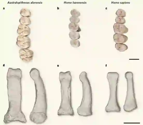 矮小之外,“吕宋人”又有一些原始特征。他们的手指和脚部骨骼呈现弯曲,这与适应攀爬生活的南方古猿类似。南方古猿是现代人和其他人属成员的古老祖先,生活在距今数百万年前的非洲大陆。另外,他们前臼齿(虎牙往里的两颗牙齿)有两个到三个牙根,这与第一批走出非洲的直立人(Homo erectus)类似,而现代人的只有一个。