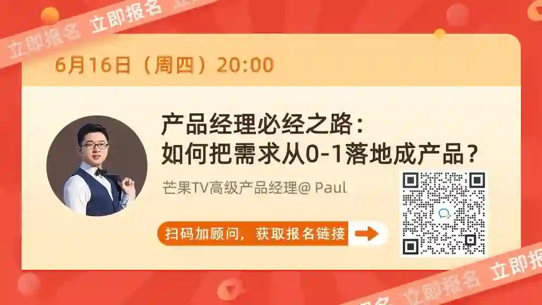 下周四晚上8点,芒果TV高级产品经理、前华为产品运营经理@ Paul,1小时带你了解【产品经理必经之路:如何把需求从0-1落地成产品?】,前50名报名听课赠送《产品经理求职资料包》!