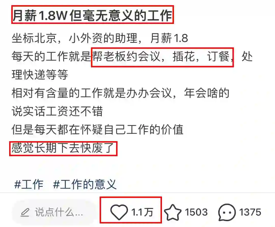 该网友在北京外企当助理,月薪1万8,工作内容看似简单轻松——帮老板约会议、插花、订餐,处理快递等。