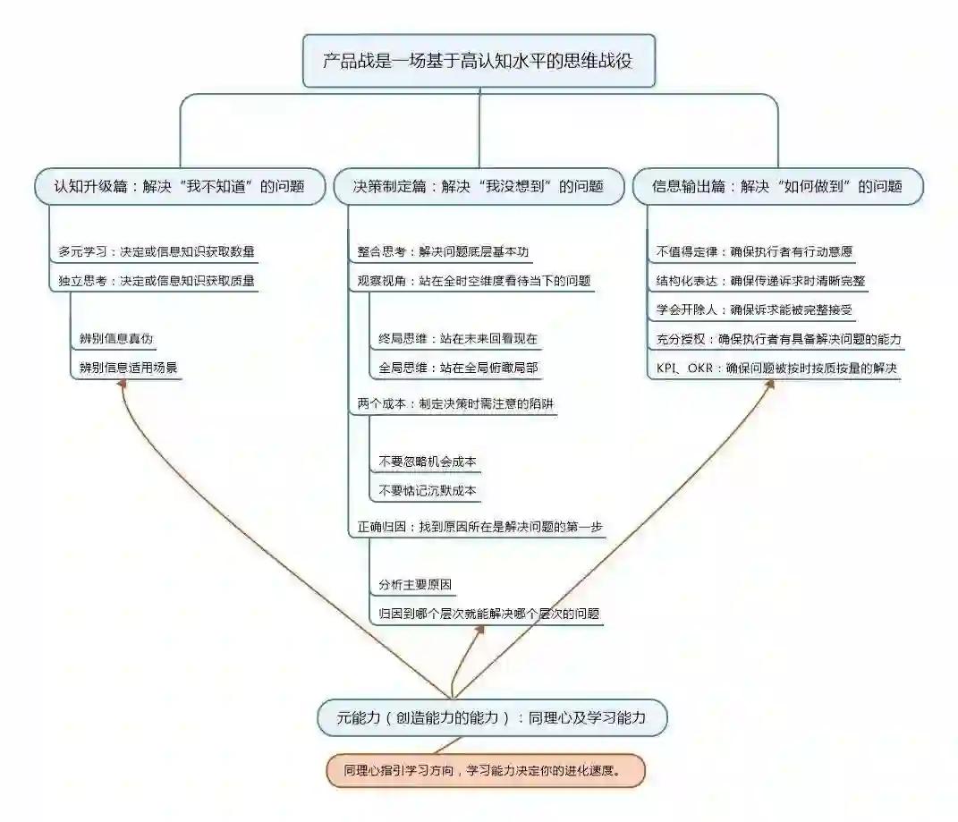 要打赢一场产品战,你要解决“我不知道”、“我没想到”、“如何做到”这三个问题,我分了三篇文章来讲述,认知升级篇、决策制定篇、信息输出篇。这里贯彻了平级之间在同一范畴及按照解决问题的时间顺序来排列分论点。