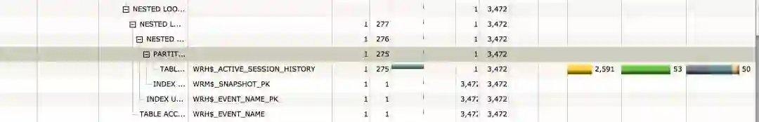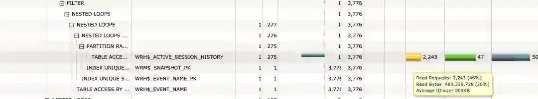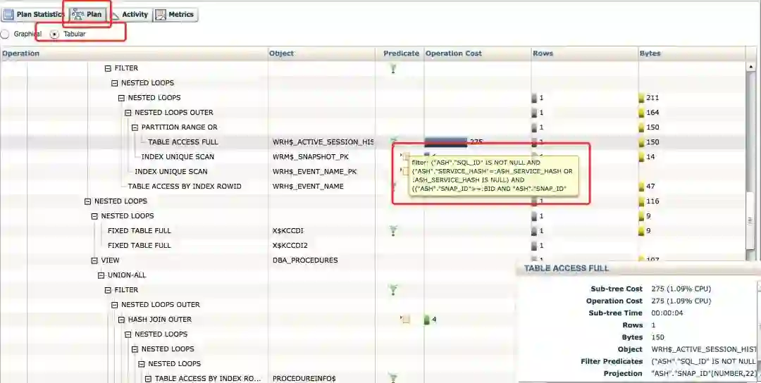 通过报告可明显观察到整个SQL消耗的IO基本来源于WRH$_ACTIVE_SESSION_HISTORY这张表。监视报告中选中plan,再以Tabular方式查看,可查看访问表的谓词,正常情况下这个表是会分区的,目前看起来数据都集中在了一个分区。