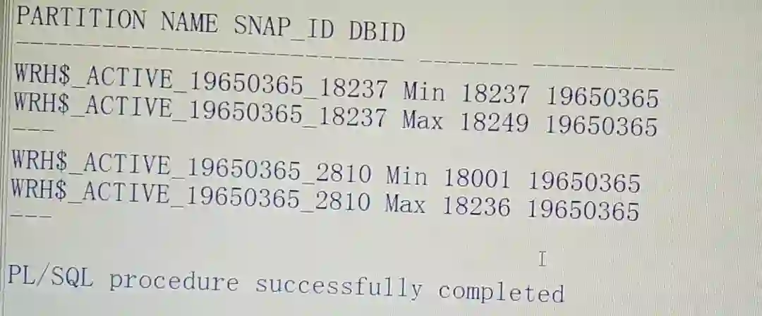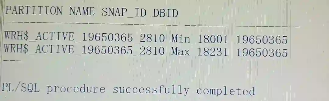 exec DBMS_WORKLOAD_REPOSITORY.DROP_SNAPSHOT_RANGE(low_snap_id =>2810,high_snap_id =>18000);