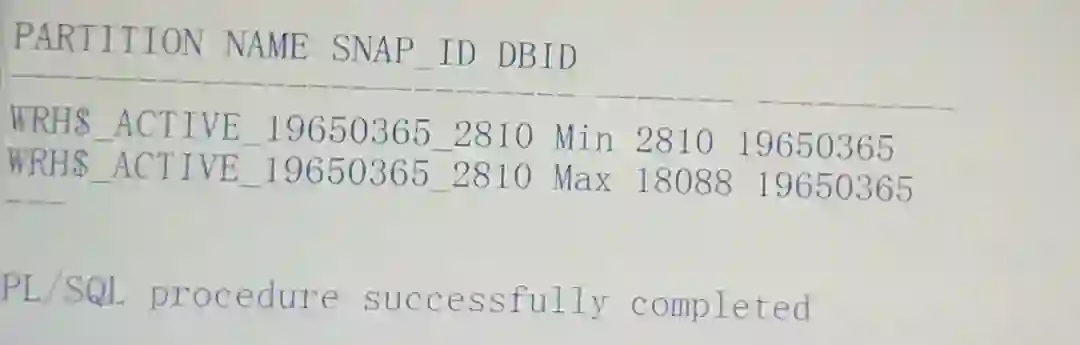 上述操作完成后,SQL已经能秒出了,然而源头问题分区表WRH$_ACTIVE_SESSION_HISTORY 是否能自动新建分区,并自动清理过期ASH数据通过以下命令(官方推荐处理方式,参考文档 387914.1)并不一定达到想要的效果。
