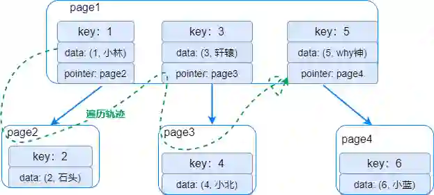 继续通过指针加载磁盘页 page4 到内存,key=4 符合,读取数据行(4,小北)。