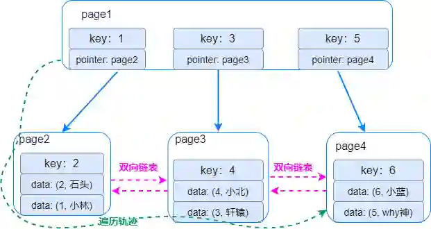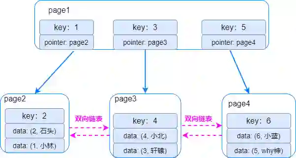 由于叶子节点间组成双向链表,直接顺着page2 加载磁盘页page3 、 加载磁盘页page4,读取其中符合条件的数据行。